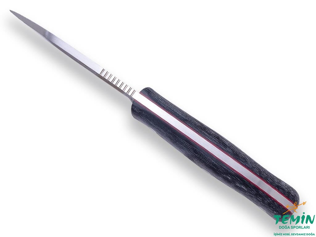 Boylu boyunca bir dışbükey kavisle karakterize edilen sırtı ve burnuna doğru, dışa hafif açılı, bir doğru şeklinde yükselen keskin kenarı bulunan bıçak; özellikle çekerek yapılan kesmelerde bilek hareketlerine yardımcıdır. Tam düz ağız açımı (flat flat grind) uygulanarak hafif, sağlam ve çok yönlü kılınan yuvarlak uçlu (drop point) bıçağın çeliği Böhler N695’tir. Bu çelik, paslanmaz çelikler içinde saygın bir yeri olan 440C’nin Böhler tarafından üretilen versiyonudur. 35 mm enindeki namlunun et kalınlığı 5 mm’dir. Keskin kenarın altındaki minik çentik, kesmeye saplayarak başlamaya hizmet etmektedir. Kavisli ağız başlangıç çizgisi (grind termination) sayesinde, uzun bir keskin kenar ve sağlam bir ricasso elde edilmiştir. Kavramaya yardımcı sıralı çentikler (jimpings), hâkimiyeti artırmaktadır. İleride konumlandırılan keskin kenar, rahat ve güvenli çalışmayı mümkün kılmaktadır. Bushcraft bıçaklarda, çalışma konforu için, genelde oldukça kısa tutulan koruyucu tırnak (quillon) da elin namludan uzak kalmasını desteklemektedir.