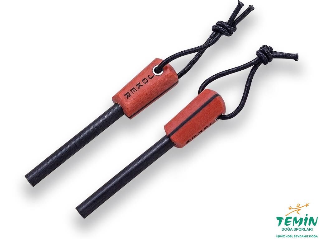 İzlediğiniz üründe, her ikisinin üzerinde de kordon deliği bulunan, kılıfa takılabilen bir ateş başlatıcı çubuk (ferrocerium rod) ve onu sürtüp kıvılcım çıkarabileceğiniz metal plaka (striker plate) bulunmaktadır. Ateş başlatıcı çubuğun (PD10) başlığı, bıçağın sap malzemesiyle aynıdır