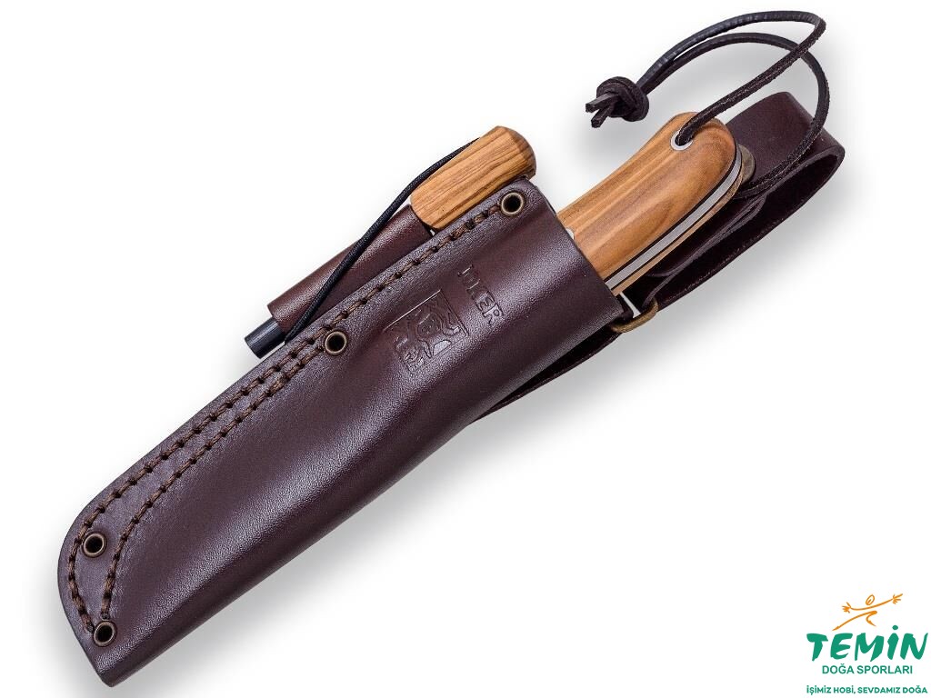İzlediğiniz üründe, kılıfa takılabilen bir ateş başlatıcı çubuk (ferrocerium rod) ve onu sürtüp kıvılcım çıkarabileceğiniz metal plaka (striker plate) bulunmaktadır. Kordon deliğine sahip ateş başlatıcı çubuğun (PD4) başlığı, bıçağın sap malzemesiyle aynıdır.