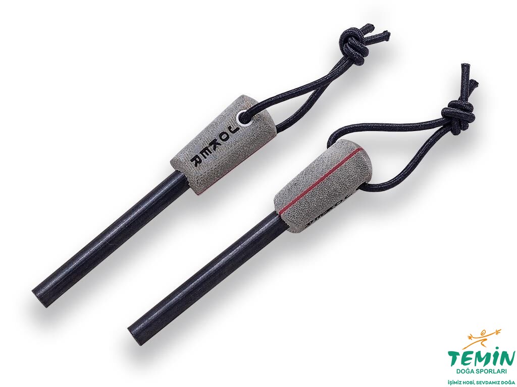 İzlediğiniz üründe, her ikisinin üzerinde de kordon deliği bulunan, kılıfa takılabilen bir ateş başlatıcı çubuk (ferrocerium rod) ve onu sürtüp kıvılcım çıkarabileceğiniz metal plaka (striker plate) bulunmaktadır. Ateş başlatıcı çubuğun (PD7) başlığı, bıçağın sap malzemesiyle aynıdır.