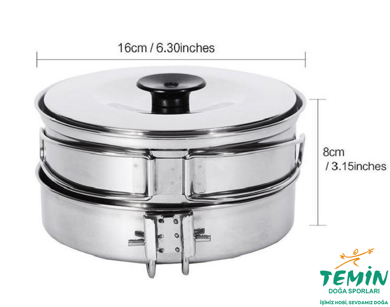 1 adet kapaklı tencere, 1 adet kızartma tavası, 2 adet tabak, 2 adet bardak, 1 adet taşıma çantasından oluşan sağlam ve çevre dostu gıda sınıfı paslanmaz çelikten imal edilmiş 2 kişilik kamp seti