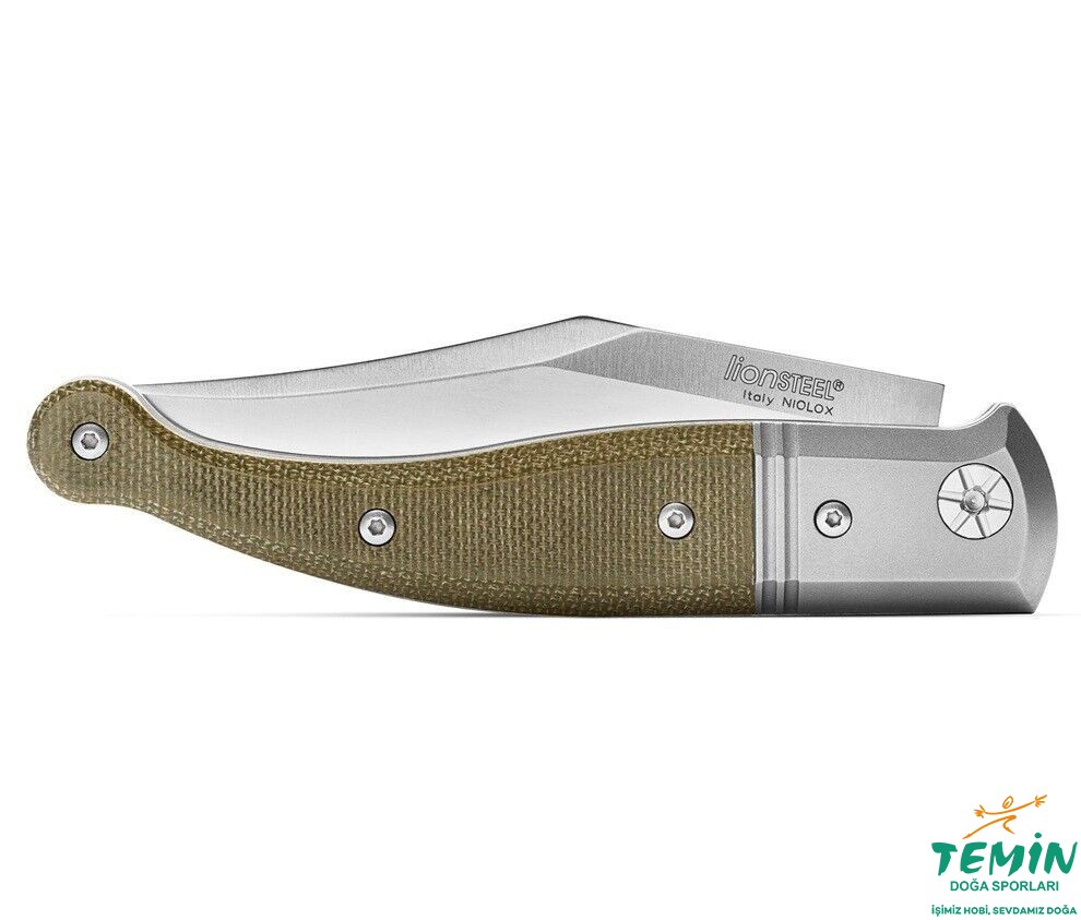 Çakının yüksek düz ağız açımı (high flat grind) uygulanan namlusu, sapından daha geniştir. Sivri uç (clip point) yapısındaki namluda, uç kısmın arkası inceltilmiştir. Sırt kısım, bir Lionsteel klasiği olarak yuvarlatılmıştır ve başparmak desteklerinde hem kontrolü artırmakta hem de rahatsızlık vermemektedir. Keskin kenarın altındaki minik çentik, kesmeye saplayarak başlamaya hizmet etmektedir.