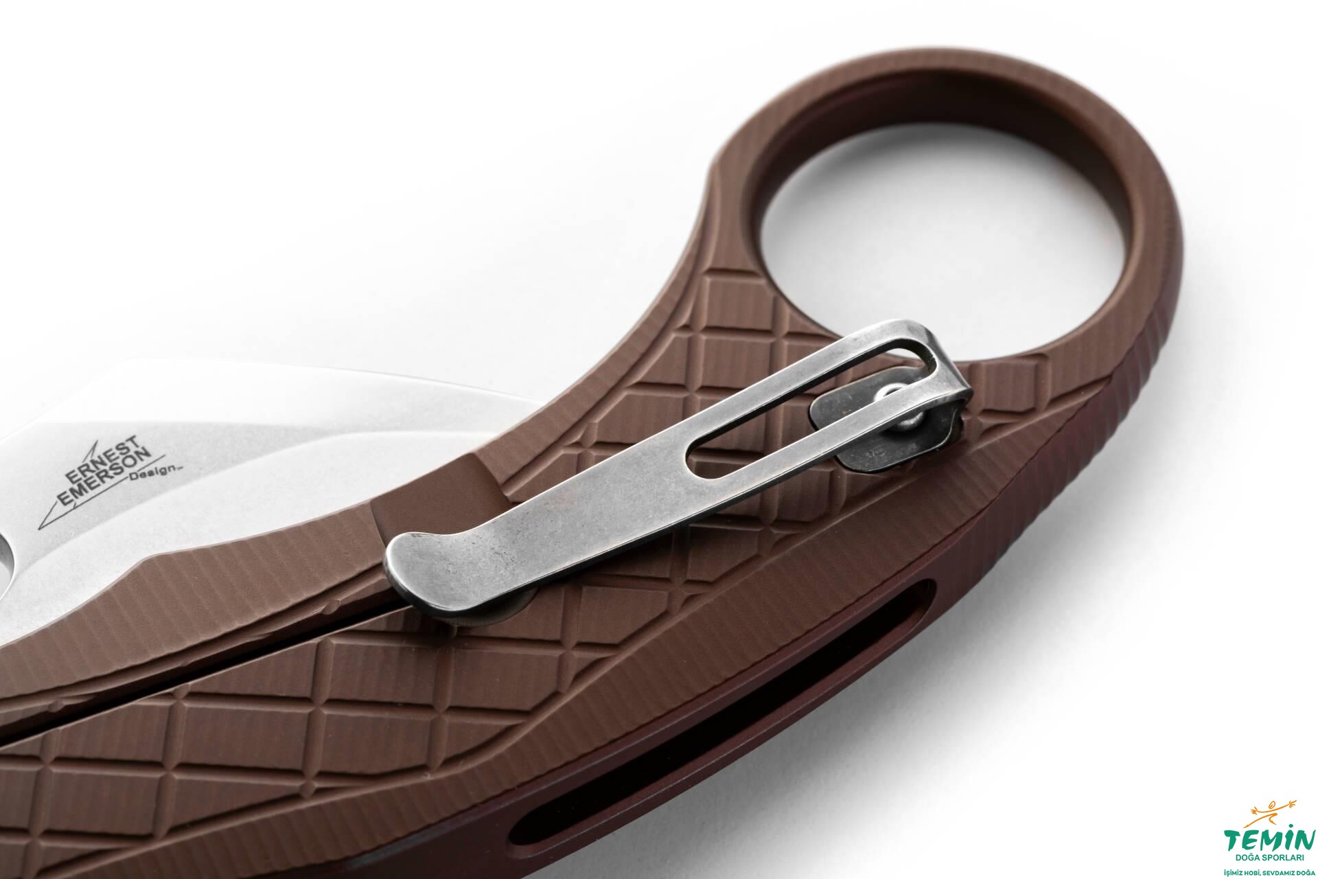 Uç yukarı olmak üzere yönü değiştirilebilen namluyla uyumlu kılınan paslanmaz çelik cep klipsleri, çakının kolay taşınmasına ve ‘‘Emerson Dalga Özelliği’’nin kullanılmasına yardımcıdır.