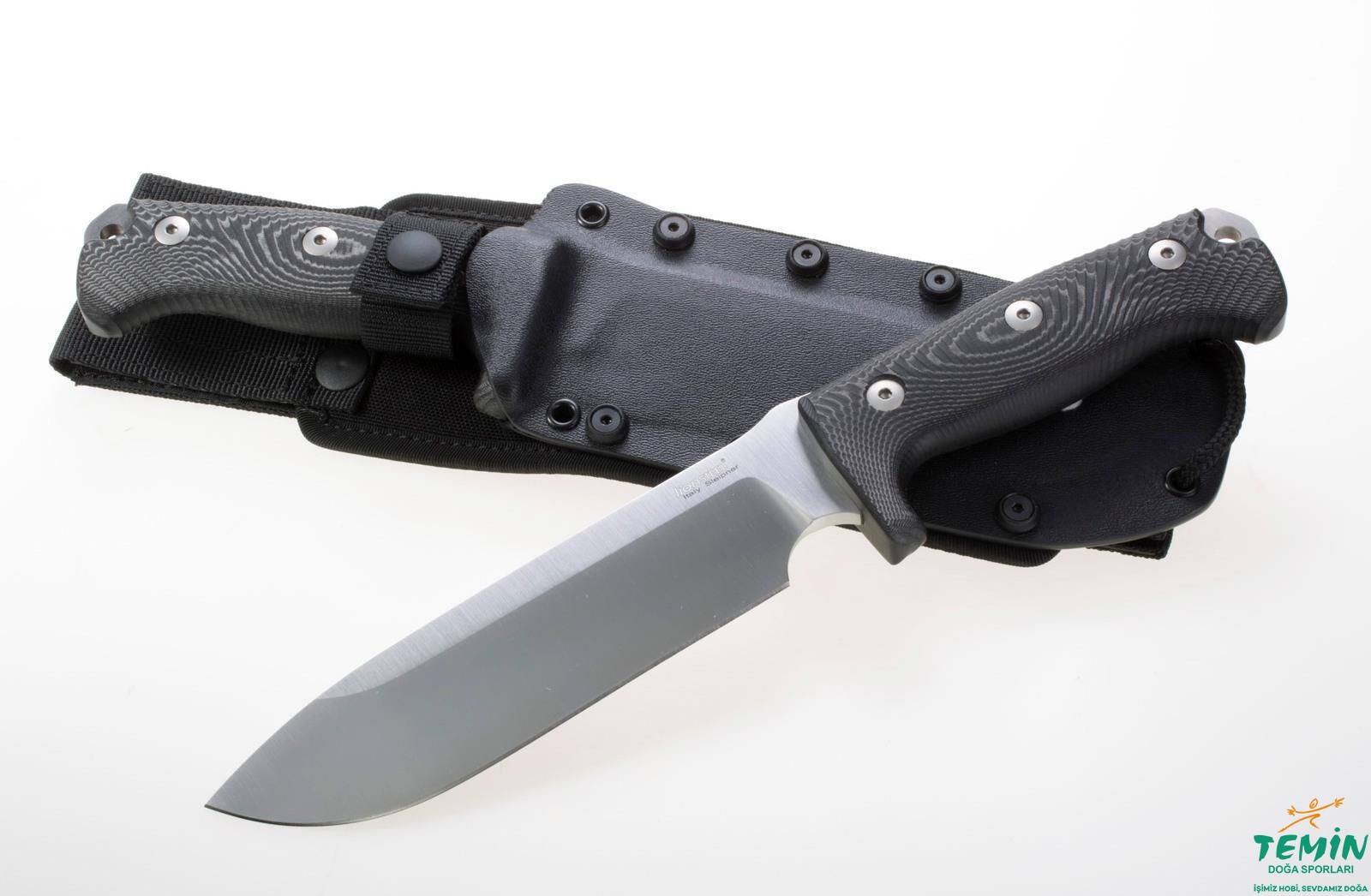 Bıçağın çeliği, dirençli yapısıyla takdir toplayan ve bilemesi çok zor olmayan, Sleipner olarak seçilmiş. 5,5 mm et kalınlığı, güven veriyor. Namlunun yüksek düz ağız açımı (high flat grind), kendisini dayanıklı ve çok yönlü kılıyor. Geniş choil, işaret parmağı yuvası olarak hizmet verebilirken bıçağın ince işlerde de kontrollü kullanılmasına olanak tanıyor. Başparmak rampalarına (thumb ramp) da güvenli ve kontrollü kullanım için yer verilmiş.