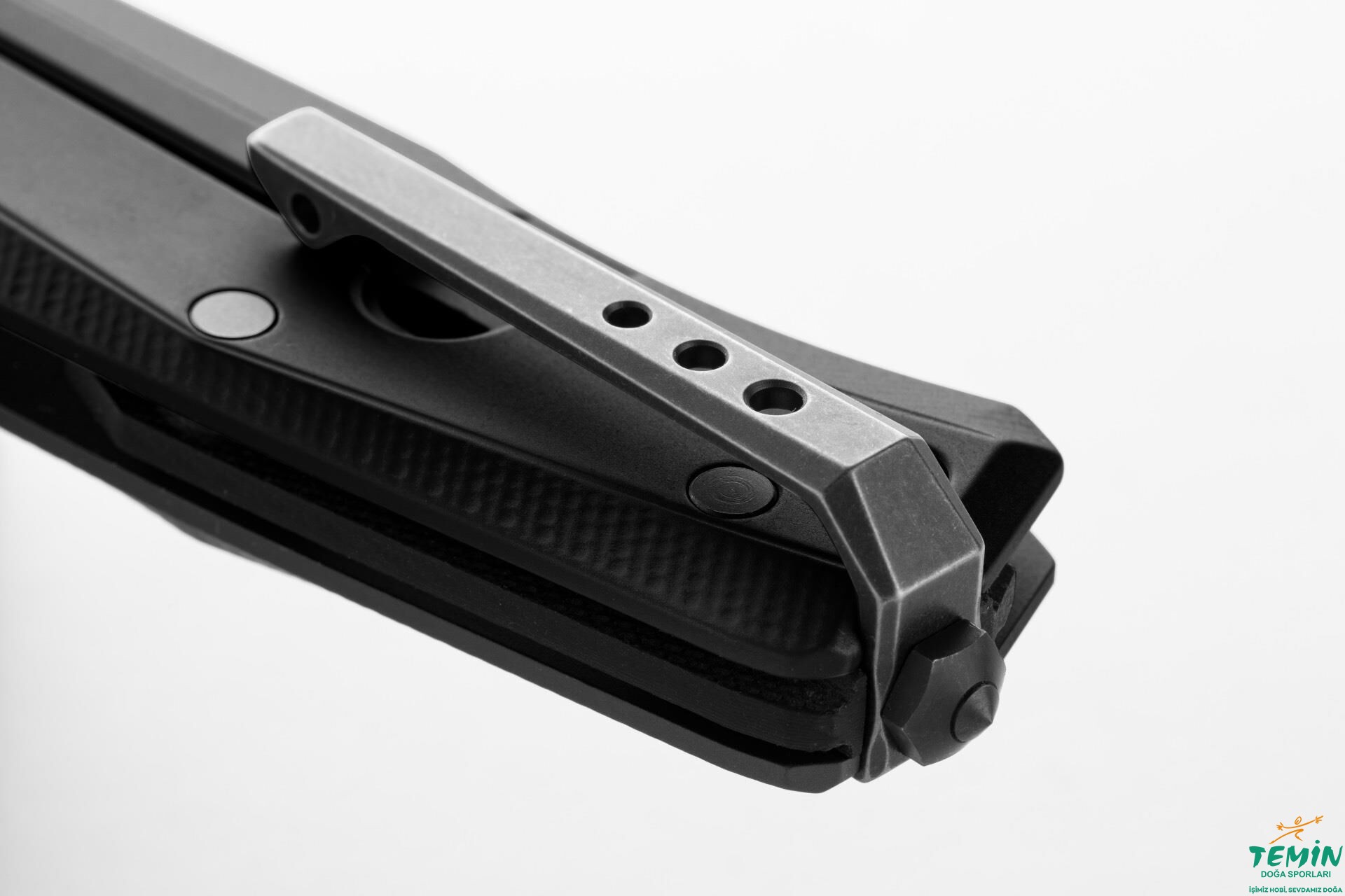 İzlediğiniz versiyon olan MT01A BB’de sapın her iki kanadı da anodize edilerek renklendirilmiş (İzlediğiniz üründe siyahtır.) alüminyumdur. Alüminyum saplı Myto’lar içinde üst düzeyi temsil eden çakının namlusu ve cep klipsi, eskitilmiş siyah (old black) görünümdedir. Bu görünüm, söz konusu kısımların taşlanması (stonewash) ve PVD (Physical Vapor Deposition-Fiziksel Buhar Biriktirme) yöntemiyle siyah renkte kaplanmasıyla ortaya çıkarılmıştır.