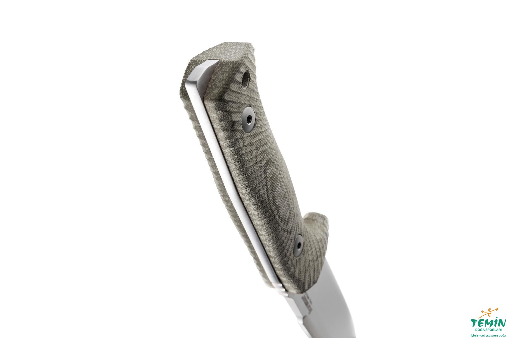 Genişçe dokulu ve yekpare kanaviçe mikarta (canvas micarta) sap, bıçağı üç yönden (yanlar ve ön) tamamen sararken alt kısmın yarıya kadarını da kapatıyor. Böylelikle sap kısmında sadece sırt ve uzatılmış kuyruk (extended tang) olarak dışa taşan [o da olmasa kapsüllenmiş (encapsulated) bıçak tanımı rahatlıkla yapılabilir], vurma amaçlı kullanılan bir kısım kuşatılmamış kalıyor. Asıl olarak sağlamlık ve rutubet başta olmak üzere çevresel koşullara karşı dayanıklılık sunan mikarta sap, hâki renkte.