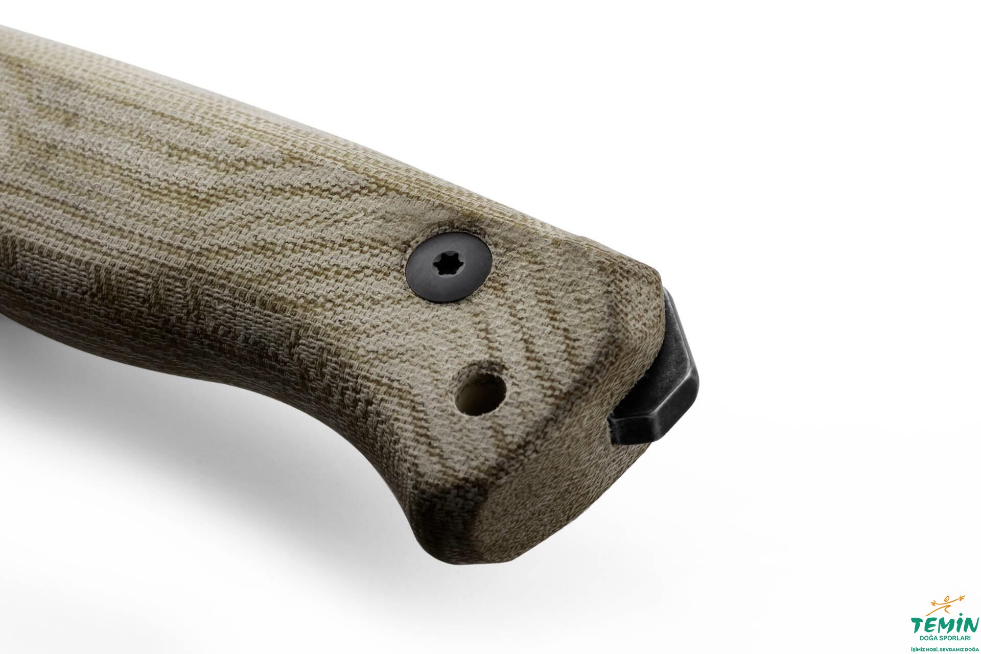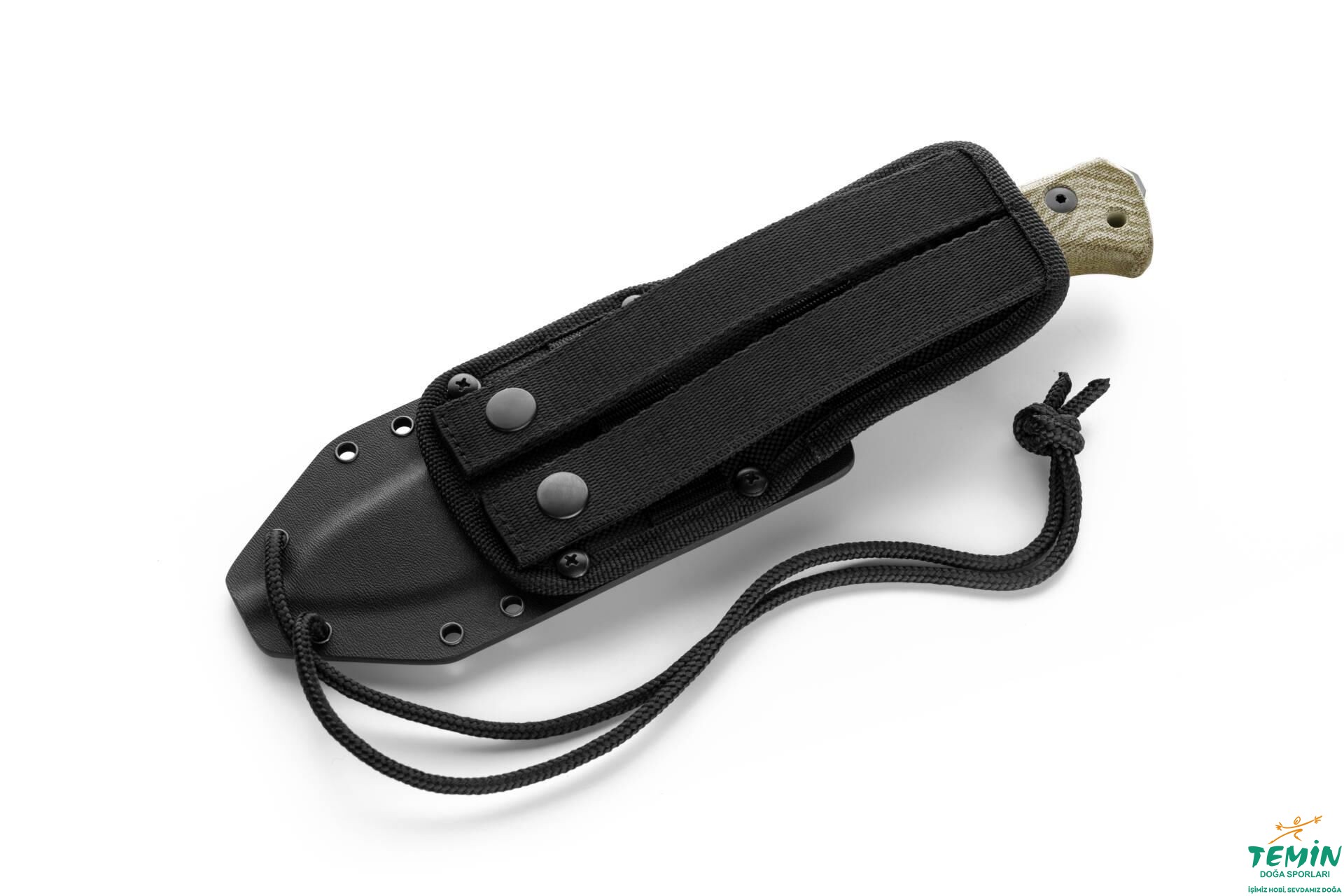 İzlediğiniz ürün (T6B 3V CVG), eskitilmiş siyah (old black) görünümüyle hem dayanıklı kılınmıştır hem de kamuflaj sağlamaktadır. Bıçak, hâki renkli kanaviçe mikarta (green canvas micarta) sap malzemesine sahiptir. Genişçe dokulu ve yüksek yoğunluklu bu malzeme, asıl olarak sağlamlık ve rutubet başta olmak üzere çevresel koşullara karşı dayanıklılık sunmaktadır. Sapının dip kısmına doğru bir kordon deliği (lanyard hole) bulunan bıçak, MOLLE (Modular Lightweight Load Carrying Equipment-Modüler Hafif Yük Taşıma Ekipmanı. Bu sistem kendisine uygun parçaların birbirine eklenmesine yarayan ordu kaynaklı bir standart içermektedir.) uyumlu kydex kılıfı ile sunulmaktadır. Kydex kılıfa farklı biçimlerde vidalanabilen cordura bağlantı elemanı sayesinde zengin taşıma seçeneklerine kavuşulmuştur.