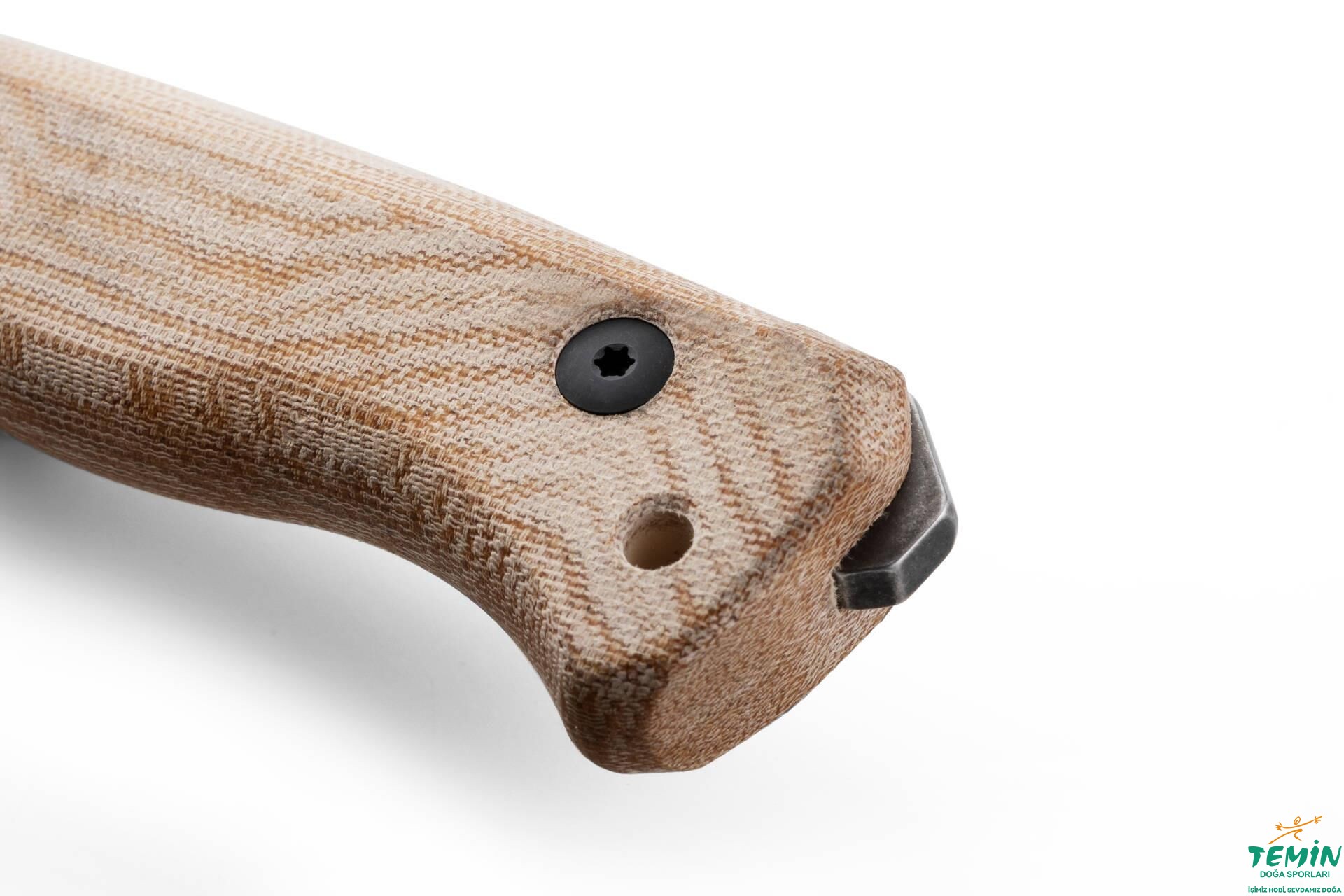 İzlediğiniz ürün (T6B 3V CVN), eskitilmiş siyah (old black) görünümüyle hem dayanıklı kılınmıştır hem de kamuflaj sağlamaktadır. Bıçak, doğal rengindeki kanaviçe mikarta (natural canvas micarta) sap malzemesine sahiptir. Genişçe dokulu ve yüksek yoğunluklu bu malzeme, asıl olarak sağlamlık ve rutubet başta olmak üzere çevresel koşullara karşı dayanıklılık sunmaktadır. Sap malzemesinin kuyruğa sabitlenmesinde Torx T8 karartılmış vidalar kullanılmıştır.