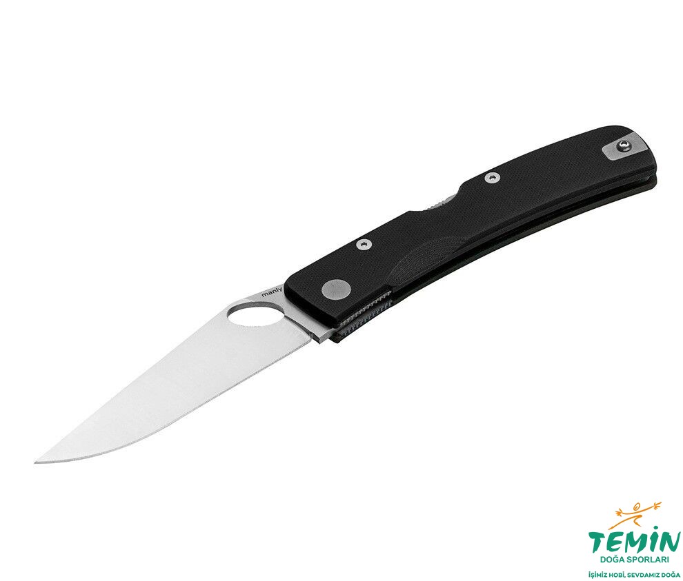 Kilitleme mekanizması sağlam bir arka kilittir. Kaymaz sap kaplamaları, dokulu siyah G10 malzemeden yapılmıştır. Yön değiştirilebilir klips (uç yukarı/sol-sağ), hem solaklar hem de sağlaklar için taşıma imkanı sunar.