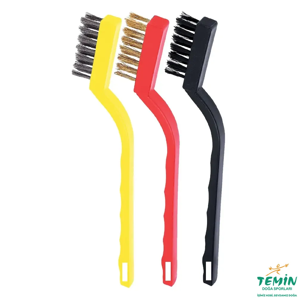 Silah bakımında detay temizlik için 3 farklı fırça tipi: çelik (inatçı kir), pirinç (daha nazik), naylon (hassas yüzey). Kompakt, pratik, çok amaçlı.