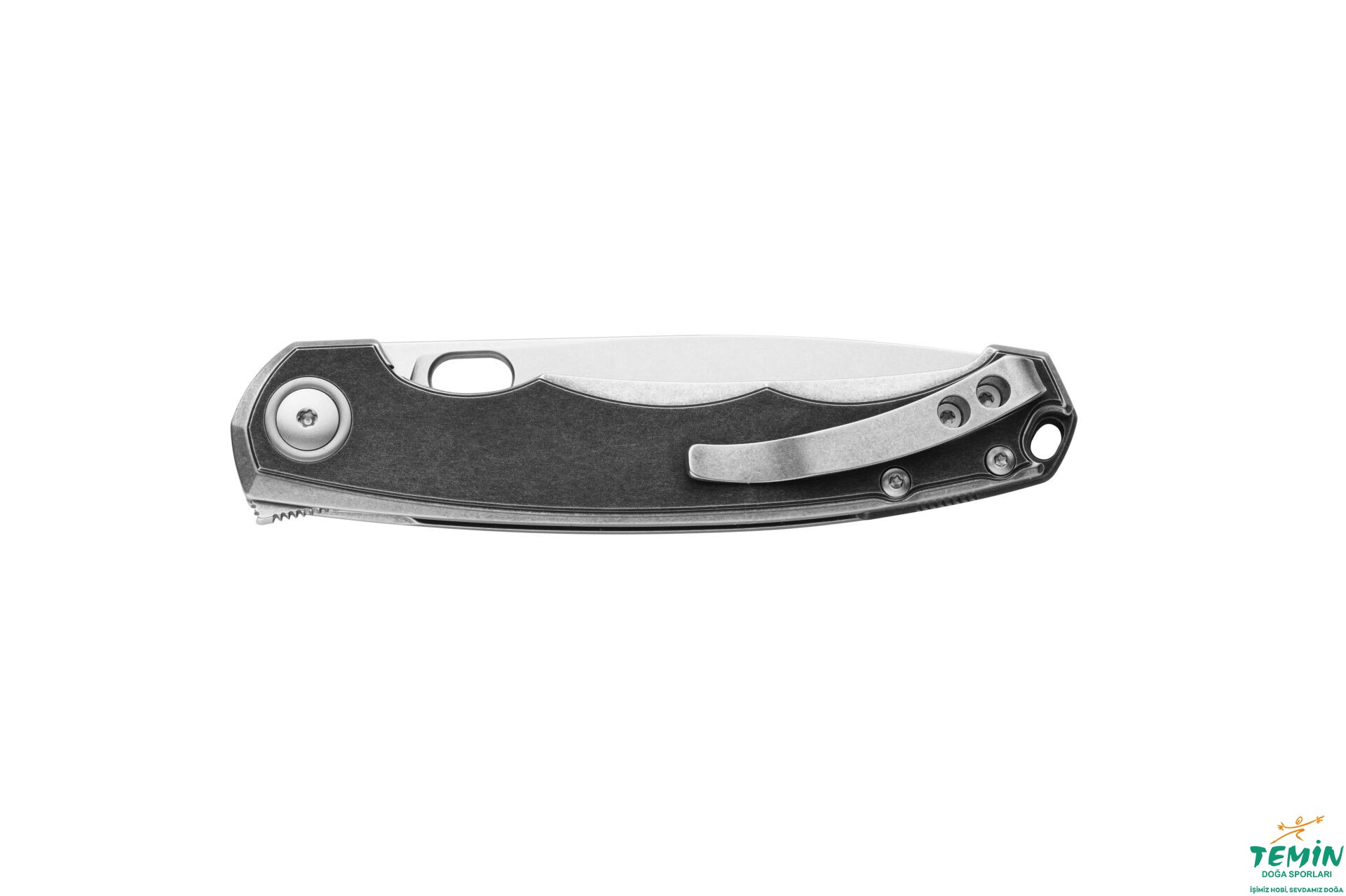 Kalın titanyum astarlar ve cep klipsi, taşlanmış (stonewash) titanyumdur. Pivot bağlantı elemanının pulu da titanyumdur.
