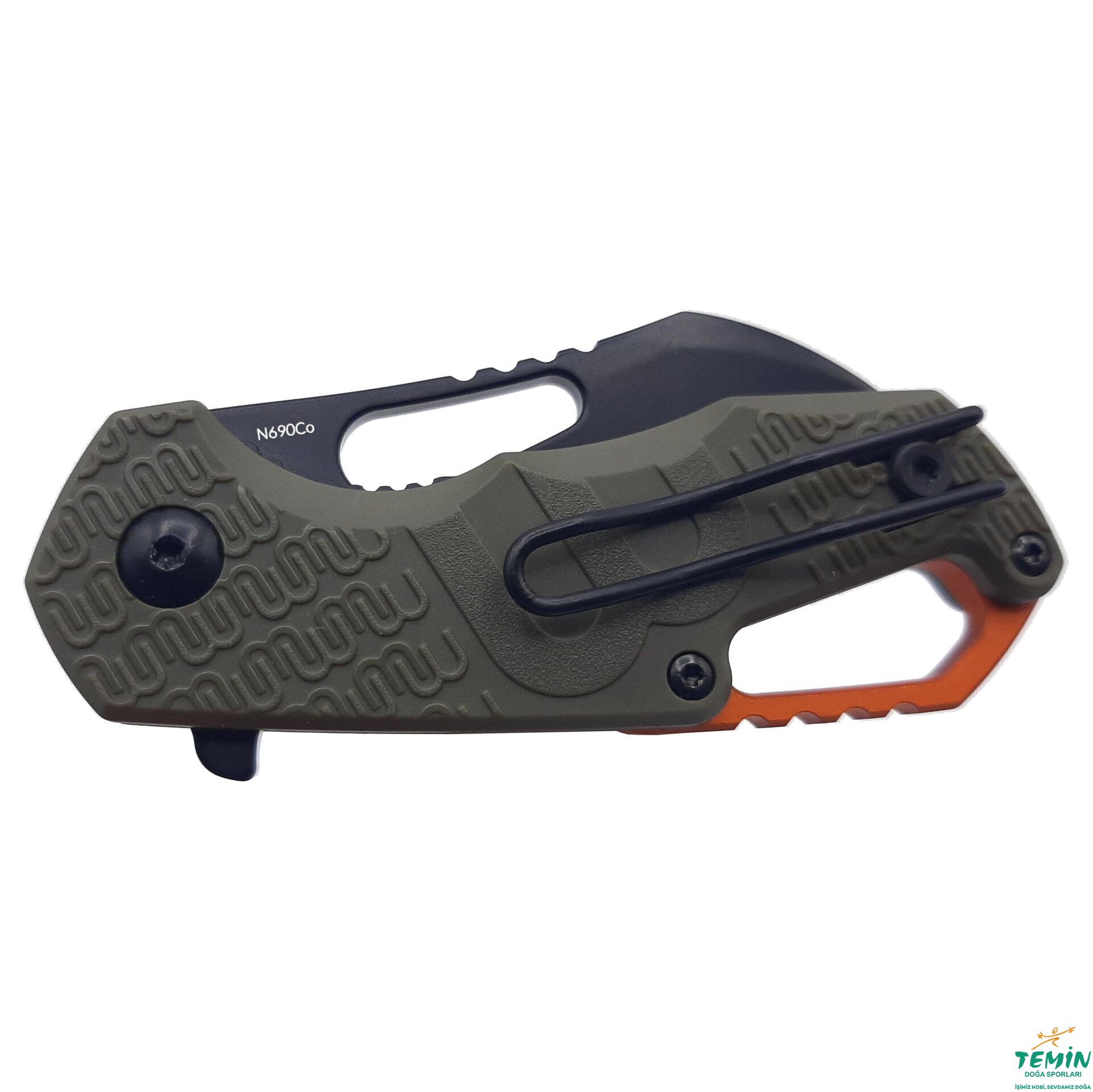 Anodize edilerek doğada kolay görünen turuncu rengi alan alüminyum ara parça sayesinde geniş bir kordon deliği (lanyard hole) elde edilmiştir. İçinden kapaklı çengel (çengel karabina da denmektedir) geçebilecek genişlikte olmasıyla pratiklik (Dağcılıkta, rafting sırasında ve hatta doğa yürüyüşlerinde bu tür taşıma tercih edilebilmektedir.) sağlayan bu kordon deliği, namludaki başparmak deliği ile de uyum taşımaktadır. Her iki deliğin arkasında da kavramaya yardımcı çentiklere yer verilerek çakıya hâkimiyet artırılmıştır. MKM’nin alametifarikası sayılan mavi renkte anodize edilen pivot bağlantı elemanı pulunun yerini turuncu renkte anodize edilen alüminyum pul almıştır.