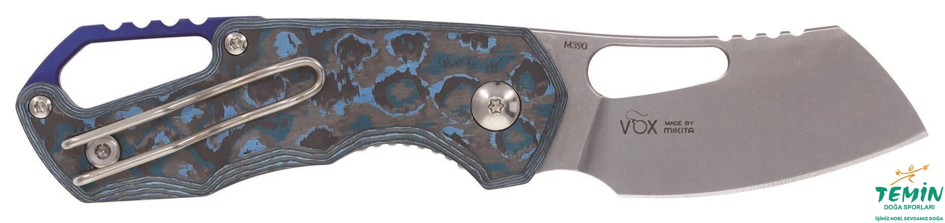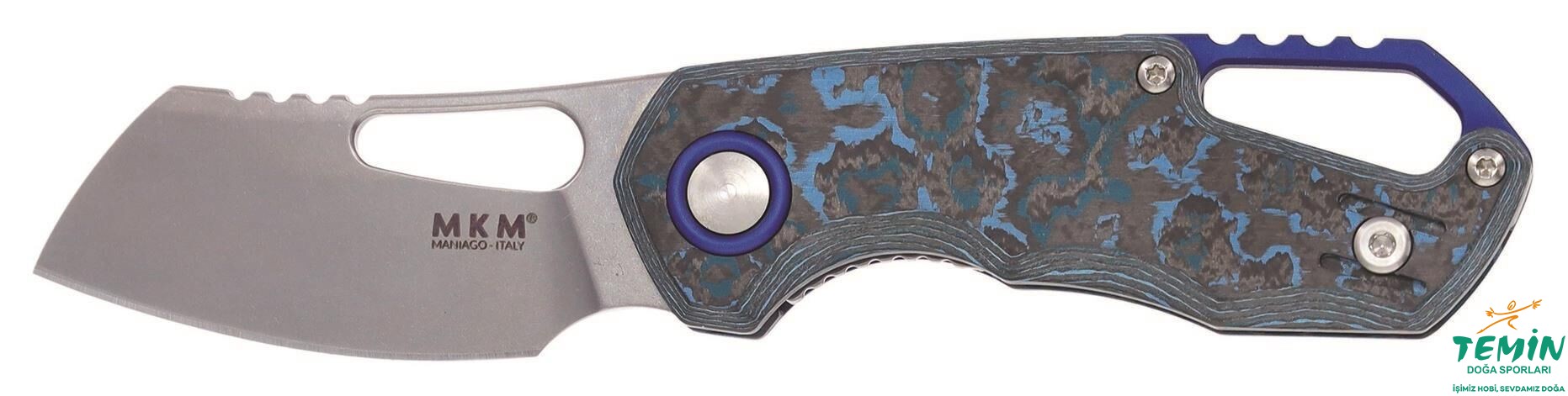 Yandan kilitli (linerlock) çakının sap kanatları, özel bir karbon fiberden (‘‘Fat Carbon Materials’’ tarafından imal edilen ‘‘Arctic Storm’’ yani ‘‘Kutup Fırtınası’’ ismindeki hafif, dayanıklı ve şık kompozit malzemeye, adı üzerinde, kutup siklonları ilham vermiştir. Buz dağlarını parçalayıp dalgaları metrelerce yükselten bu güçlü doğa olayına uzaydan bakıldığında ise, dingin ve yatıştırıcı bir mozaik izlenmektedir. Mavi ve grinin tonlarını taşıyan malzemede, elle yerleştirilen karbon fiber katmanların epoksi ile birleştirilmesiyle, hayranlık uyandıran bir görünüm elde edilmiştir.) imal edilmiştir. Sap malzemesi içine gömülü çelik astarlar, sağlamlığı pekiştirmektedir. Sapın yerine takılmasında yine paslanmaz çelik bağlantı elemanlarının [Cıvataları söküp takabileceğiniz tork anahtarı (6/8) da pakete dâhildir.] kullanıldığı bu versiyonda, anodize edilerek mavi renk alan alüminyum ara parça sayesinde, geniş bir kordon deliği (lanyard hole) elde edilmiştir. İçinden kapaklı çengel (çengel karabina da denmektedir) geçebilecek genişlikte olmasıyla pratiklik (Dağcılıkta, rafting sırasında ve hatta doğa yürüyüşlerinde bu tür taşıma tercih edilebilmektedir.) sağlayan bu kordon deliği, namludaki başparmak deliği ile uyum taşımaktadır. Kordon deliğinin arkasında da kavramaya yardımcı çentiklere yer verilerek çakının daha iyi kavranması sağlanmıştır. MKM’nin alametifarikası sayılan pivot bağlantı elemanı pulu, yine mavi renk alacak biçimde anodize edilerek, ara parçayla uyumlu kılınan alüminyumdur. MKM’nin kullanmayı sevdiği mavi rengin kökeninde ise, Maniago bıçak üretiminin ilk itiş gücünü sağlayan nehirler bulunmaktadır.