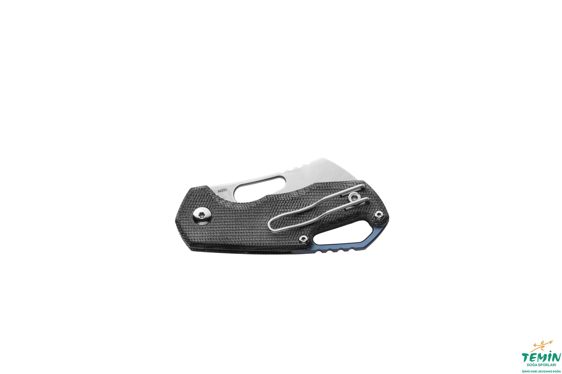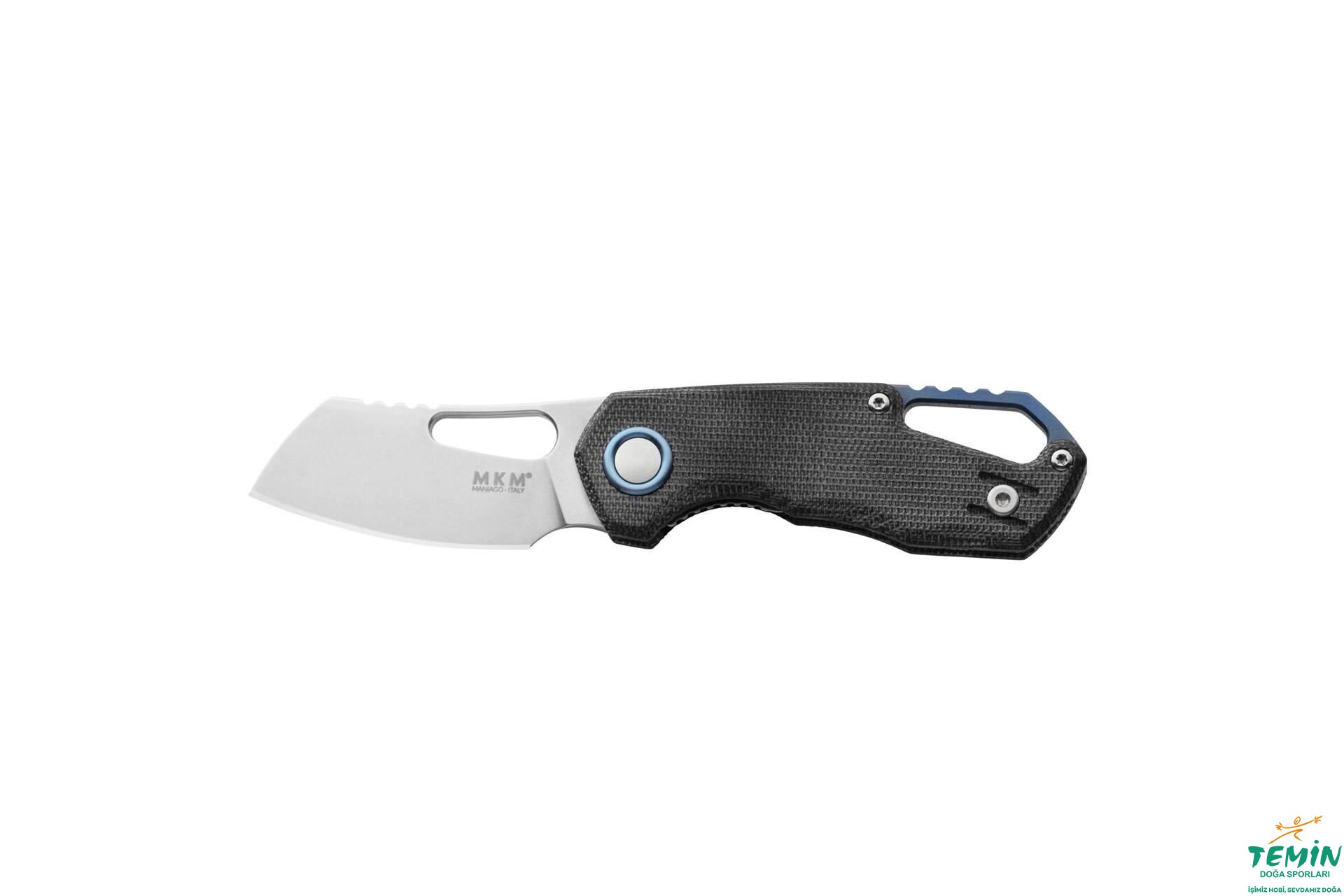 Yandan kilitli (linerlock) çakıda, siyah kanaviçe mikarta (black canvas micarta) sap malzemesi bulunmaktadır. Kanaviçe mikarta, keten (linen) mikartaya göre daha geniş gözenekli olup daha kaba ve kavranabilir yapıdadır. Mikarta sap hem suya hem de ateşe dayanıklıdır ve ıslak koşullarda bile iyi kavranabilmektedir. Sap malzemesi içine gömülü çelik astarlar, sağlamlığı pekiştirmektedir. Sapın yerine takılmasında yine paslanmaz çelik bağlantı elemanlarının [Cıvataları söküp takabileceğiniz tork anahtarı (6/8) da pakete dâhildir.] kullanıldığı bu versiyonda, anodize edilerek mavi renk alan titanyum ara parça sayesinde, geniş bir kordon deliği (lanyard hole) elde edilmiştir. İçinden kapaklı çengel (çengel karabina da denmektedir) geçebilecek genişlikte olmasıyla pratiklik (Dağcılıkta, rafting sırasında ve hatta doğa yürüyüşlerinde bu tür taşıma tercih edilebilmektedir.) sağlayan bu kordon deliği, namludaki başparmak deliği ile uyum taşımaktadır. Kordon deliğinin arkasında da kavramaya yardımcı çentiklere yer verilerek çakının daha iyi kavranması sağlanmıştır. MKM’nin alametifarikası sayılan pivot bağlantı elemanı pulu, yine mavi renk alacak biçimde anodize edilerek, ara parçayla uyumlu kılınan titanyumdur. MKM’nin kullanmayı sevdiği mavi rengin kökeninde ise, Maniago bıçak üretiminin ilk itiş gücünü sağlayan nehirler bulunmaktadır.