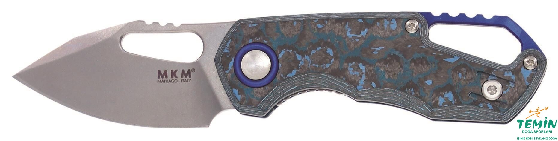 Yandan kilitli (linerlock) çakının sap kanatları, özel bir karbon fiberden (‘‘Fat Carbon Materials’’ tarafından imal edilen ‘‘Arctic Storm’’ yani ‘‘Kutup Fırtınası’’ ismindeki hafif, dayanıklı ve şık kompozit malzemeye, adı üzerinde, kutup siklonları ilham vermiştir. Buz dağlarını parçalayıp dalgaları metrelerce yükselten bu güçlü doğa olayına uzaydan bakıldığında ise, dingin ve yatıştırıcı bir mozaik izlenmektedir. Mavi ve grinin tonlarını taşıyan malzemede, elle yerleştirilen karbon fiber katmanların epoksi ile birleştirilmesiyle, hayranlık uyandıran bir görünüm elde edilmiştir.) imal edilmiştir. Sap malzemesi içine gömülü çelik astarlar, sağlamlığı pekiştirmektedir. Sapın yerine takılmasında yine paslanmaz çelik bağlantı elemanlarının [Cıvataları söküp takabileceğiniz tork anahtarı (6/8) da pakete dâhildir.] kullanıldığı bu versiyonda, anodize edilerek mavi renk alan alüminyum ara parça sayesinde, geniş bir kordon deliği (lanyard hole) elde edilmiştir. İçinden kapaklı çengel (çengel karabina da denmektedir) geçebilecek genişlikte olmasıyla pratiklik (Dağcılıkta, rafting sırasında ve hatta doğa yürüyüşlerinde bu tür taşıma tercih edilebilmektedir.) sağlayan bu kordon deliği, namludaki başparmak deliği ile uyum taşımaktadır. Kordon deliğinin arkasında da kavramaya yardımcı çentiklere yer verilerek çakının daha iyi kavranması sağlanmıştır. MKM’nin alametifarikası sayılan pivot bağlantı elemanı pulu, yine mavi renk alacak biçimde anodize edilerek, ara parçayla uyumlu kılınan alüminyumdur. MKM’nin kullanmayı sevdiği mavi rengin kökeninde ise, Maniago bıçak üretiminin ilk itiş gücünü sağlayan nehirler bulunmaktadır.