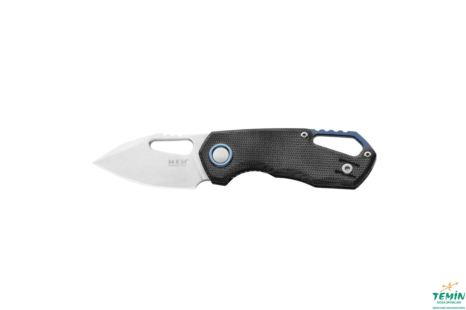 Yandan kilitli (linerlock) çakıda, siyah kanaviçe mikarta (black canvas micarta) sap malzemesi bulunmaktadır. Kanaviçe mikarta, keten (linen) mikartaya göre daha geniş gözenekli olup daha kaba ve kavranabilir yapıdadır. Mikarta sap hem suya hem de ateşe dayanıklıdır ve ıslak koşullarda bile iyi kavranabilmektedir. Sap malzemesi içine gömülü çelik astarlar, sağlamlığı pekiştirmektedir. Sapın yerine takılmasında yine paslanmaz çelik bağlantı elemanlarının [Cıvataları söküp takabileceğiniz tork anahtarı (6/8) da pakete dâhildir.] kullanıldığı bu versiyonda, anodize edilerek mavi renk alan titanyum ara parça sayesinde, geniş bir kordon deliği (lanyard hole) elde edilmiştir. İçinden kapaklı çengel (çengel karabina da denmektedir) geçebilecek genişlikte olmasıyla pratiklik (Dağcılıkta, rafting sırasında ve hatta doğa yürüyüşlerinde bu tür taşıma tercih edilebilmektedir.) sağlayan bu kordon deliği, namludaki başparmak deliği ile uyum taşımaktadır. Her iki deliğin arkasında da kavramaya yardımcı çentiklere yer verilerek çakıya hâkimiyet artırılmıştır. MKM’nin alametifarikası sayılan pivot bağlantı elemanı pulu, yine mavi renk alacak biçimde anodize edilerek, ara parçayla uyumlu kılınan titanyumdur. MKM’nin kullanmayı sevdiği mavi rengin kökeninde ise, Maniago bıçak üretiminin ilk itiş gücünü sağlayan nehirler bulunmaktadır.