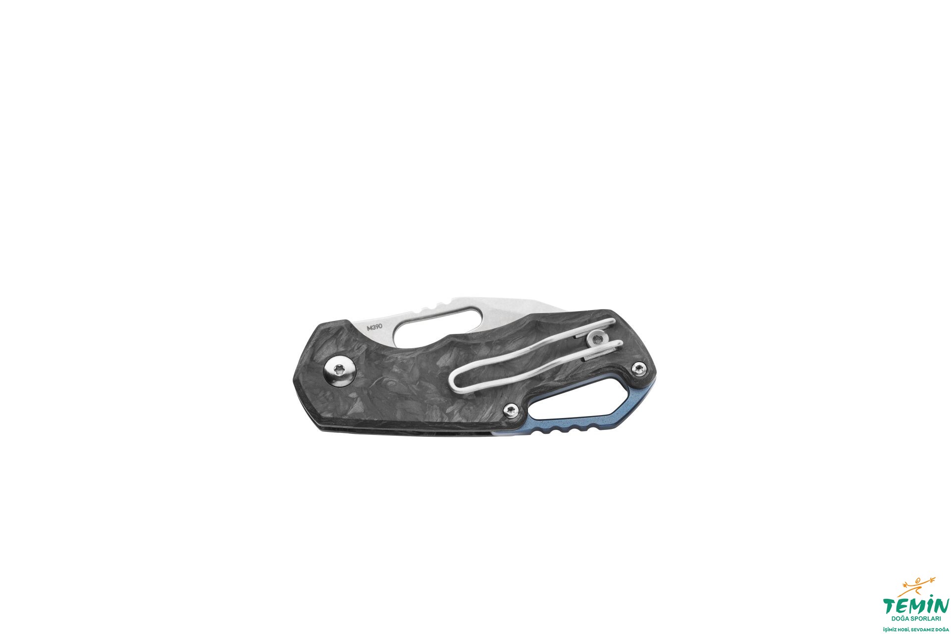Yandan kilitli (linerlock) çakı, mermer (marble) denen desende, karbon fiber sap malzemesine sahiptir ve serinin üst düzeyini temsil etmektedir. Bu modern malzeme hem dayanıklı hem şık hem de hafiftir. Sap malzemesi içine gömülü çelik astarlar, sağlamlığı pekiştirmektedir. Sapın yerine takılmasında yine paslanmaz çelik bağlantı elemanlarının [Cıvataları söküp takabileceğiniz tork anahtarı (6/8) da pakete dâhildir.] kullanıldığı bu versiyonda, anodize edilerek mavi renk alan titanyum ara parça sayesinde, geniş bir kordon deliği (lanyard hole) elde edilmiştir. İçinden kapaklı çengel (çengel karabina da denmektedir) geçebilecek genişlikte olmasıyla pratiklik (Dağcılıkta, rafting sırasında ve hatta doğa yürüyüşlerinde bu tür taşıma tercih edilebilmektedir.) sağlayan bu kordon deliği, namludaki başparmak deliği ile uyum taşımaktadır. Her iki deliğin arkasında da kavramaya yardımcı çentiklere yer verilerek çakıya hâkimiyet artırılmıştır. MKM’nin alametifarikası sayılan pivot bağlantı elemanı pulu, yine mavi renk alacak biçimde anodize edilerek, ara parçayla uyumlu kılınan titanyumdur. MKM’nin kullanmayı sevdiği mavi rengin kökeninde ise, Maniago bıçak üretiminin ilk itiş gücünü sağlayan nehirler bulunmaktadır.