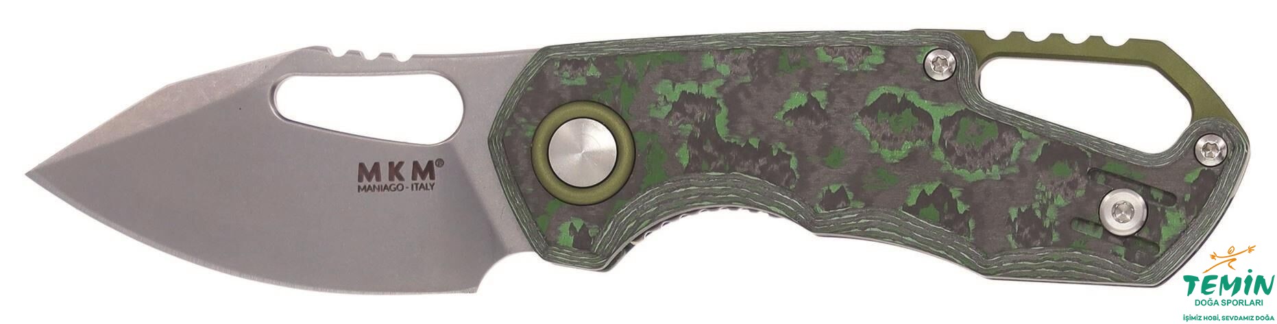 Yandan kilitli (linerlock) çakının sap kanatları, özel bir karbon fiberden (Yenilenebilir enerji kaynakları kullanan ‘‘Fat Carbon Materials’’ tarafından imal edilen ‘‘Jungle Wear’’ ismindeki hafif, dayanıklı ve şık kompozit malzemeye, adı üzerinde, yağmur ormanlarının korunmasının önemi ilham vermiştir. Dünyadaki oksijenin yaklaşık %20'sini üreten yağmur ormanları, kirlilik seviyesinin azaltılmasında da çok önemli rol oynamaktadır. Ormanda kamuflaj sağlayacak biçimde yeşilin iki tonuyla oluşturulan malzemede, elle yerleştirilen karbon fiber katmanların epoksi ile birleştirilmesiyle, hayranlık uyandıran bir görünüm elde edilmiştir.) imal edilmiştir. Sap malzemesi içine gömülü çelik astarlar, sağlamlığı pekiştirmektedir. Sapın yerine takılmasında paslanmaz çelik bağlantı elemanlarının [Cıvataları söküp takabileceğiniz tork anahtarı (6/8) da pakete dâhildir.] kullanıldığı bu versiyonda, anodize edilerek hâki renk alan alüminyum ara parça sayesinde, geniş bir kordon deliği (lanyard hole) elde edilmiştir. İçinden kapaklı çengel (çengel karabina da denmektedir) geçebilecek genişlikte olmasıyla pratiklik (Dağcılıkta, rafting sırasında ve hatta doğa yürüyüşlerinde bu tür taşıma tercih edilebilmektedir.) sağlayan bu kordon deliği, namludaki başparmak deliği ile uyum taşımaktadır. Kordon deliğinin arkasında da kavramaya yardımcı çentiklere yer verilerek çakının daha iyi kavranması sağlanmıştır. MKM’nin alametifarikası sayılan pivot bağlantı elemanı pulu, yine hâki renk alacak biçimde anodize edilerek, ara parçayla uyumlu kılınan alüminyumdur.