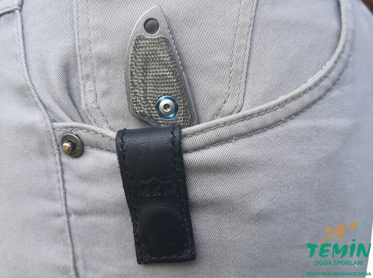 Sap kısmının dibinde kordon deliğine (lanyard hole) de yer verilen bıçağın, deri kılıfı (siyah) bulunmaktadır. Kılıfın tasarımına özen gösterildiğini belirtmek gerekir. Öncelikle bıçak, her iki yönü ile de kılıfa girebilmekte ve bu sayede sağ ya da sol elini kullananlar için problem oluşturmamaktadır. Çift taraflı manyetik kilide (Bıçağın düşmemesi için önden ya da kılıfın giysilere entegre olabilmesi için arkadan sabitlenebilir.) ve kordon deliğine sahip kılıf sayesinde bıçağı, cepte (Kılıfın manyetik kilidi, kumaşı sıkıştırarak onun üzerinden arka tarafa sabitlendiğinde, cepte tutunma sağlamaktadır.) ya da boynunuza asarak (Bıçakla birlikte deri kordon da verilmektedir.) taşıyabilirsiniz.