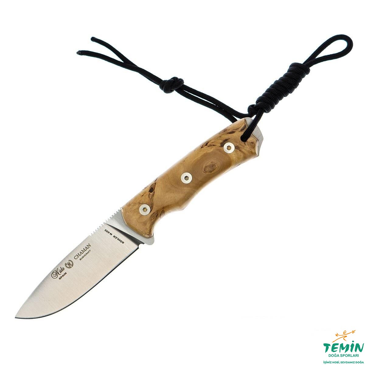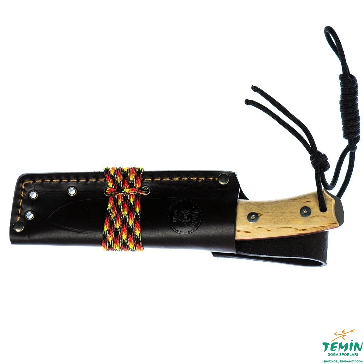 139 Chaman Bushcraft A, değişik pozisyonlarda taşınabilen deri kılıfıyla sunulmaktadır. Kılıf üzerine, 1 metre uzunluğunda, paraşüt ipi (paracord) sarılıdır.