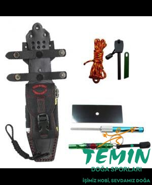 Bıçak ve deri kılıfın yanında; kılıfa takılıp çıkarılabilir kapaklı ek bölüm (alet kesesi), ateş başlatıcı çubuk, düdük, 3 metrelik paraşüt ipi (550 paracord), elmastan bileme aleti ve sinyal aynası (helyograf).