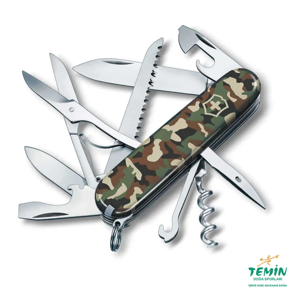 Huntsman Kamuflaj 1.3713.94; 91 mm / 97 g. Makas + ahşap testereyle kamp/doğa kullanımında pratik; 15 fonksiyonlu İsviçre çakısı.